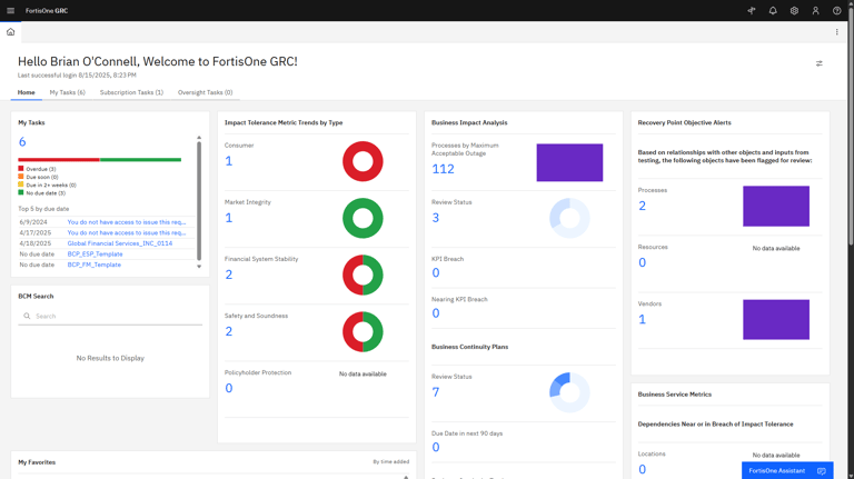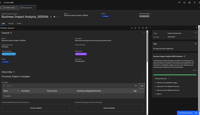FortisOne GRC streamlines continuity management with intelligent views and configurable workflows that enforce a consistent approach across the enterprise. Tasks are automatically routed to the right stakeholders for business impact analyses and continuity planning, while pre-populated fields and step-by-step guidance accelerate execution, reduce errors, and ensure plans are both efficient and resilient.